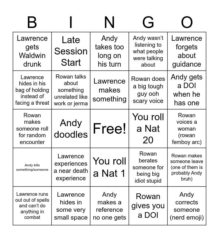 This bingo card has a free space and 24 words: Lawrence experiences a near death experience, Lawrence hides in some very small space, Lawrence makes something, Lawrence runs out out of spells and can’t do anything in combat, Lawrence forgets about guidance, Lawrence gets Waldwin drunk, Lawrence hides in his bag of holding instead of facing a threat, Late Session Start, You roll a Nat 20, You roll a Nat 1, Rowan does a big tough guy ooh scary voice, Rowan makes someone roll for random encounter, Rowan berates someone for being big idiot stupid, Rowan makes someone leave (one of them is probably Andy bruh), Rowan talks about something unrelated like work or jerma, Rowan gives you a DOI, Rowan voices a woman (rowan femboy arc), Andy takes too long on his turn, Andy gets a DOI when he has one, Andy doodles, Andy corrects someone (nerd emoji), Andy kills something/someone, Andy wasn’t listening to what people were talking about and Andy makes a reference no one gets.
