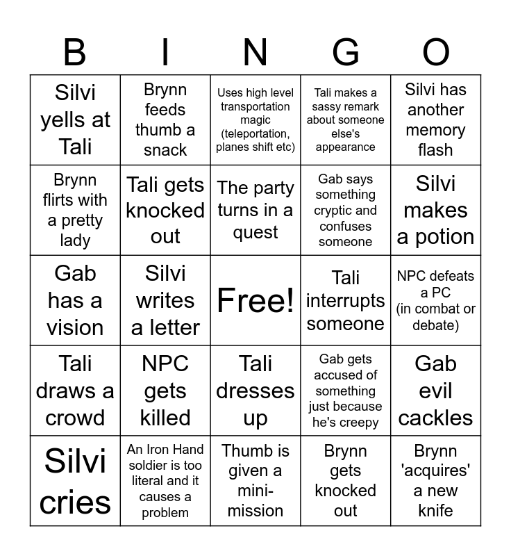This bingo card has a free space and 24 words: NPC gets killed, An Iron Hand soldier is too literal and it causes a problem, The party turns in a quest, Silvi cries, Silvi has another memory flash, Silvi yells at Tali, Brynn flirts with a pretty lady, Brynn feeds thumb a snack, Tali interrupts someone, Tali dresses up, Gab says something cryptic and confuses someone, Gab has a vision, Gab gets accused of something just because he's creepy, Gab evil cackles, Tali gets knocked out, Brynn gets knocked out, NPC defeats a PC (in combat or debate), Uses high level transportation magic (teleportation, planes shift etc), Silvi makes a potion, Silvi writes a letter, Brynn 'acquires' a new knife, Tali draws a crowd, Tali makes a sassy remark about someone else's appearance and Thumb is given a mini-mission.
