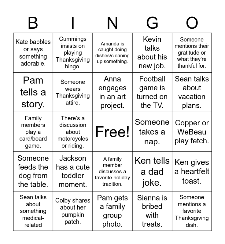 This bingo card has a free space and 27 words: Ken tells a dad joke., Sean sleeps in., Football game is turned on the TV., Pam gets a family group photo., Pam tells a story., Amanda is caught doing dishes/cleaning up something., Cummings insists on playing Thanksgiving bingo., Someone feeds the dog from the table., Someone takes a nap., Ken gives a heartfelt toast., Family members play a card/board game., Kevin talks about his new job., Sean talks about something medical-related, Colby shares about her pumpkin patch., Sean talks about vacation plans., Scott talks about his Tesla or a finance-related concept, Someone wears Thanksgiving attire., Anna engages in an art project., Jackson has a cute toddler moment., Kate babbles or says something adorable., Copper or WeBeau play fetch., Sienna is bribed with treats., There’s a discussion about motorcycles or riding., Someone mentions a favorite Thanksgiving dish., A family member discusses a favorite holiday tradition., Someone mentions their gratitude or what they're thankful for. and A technology-related discussion or debate takes place..