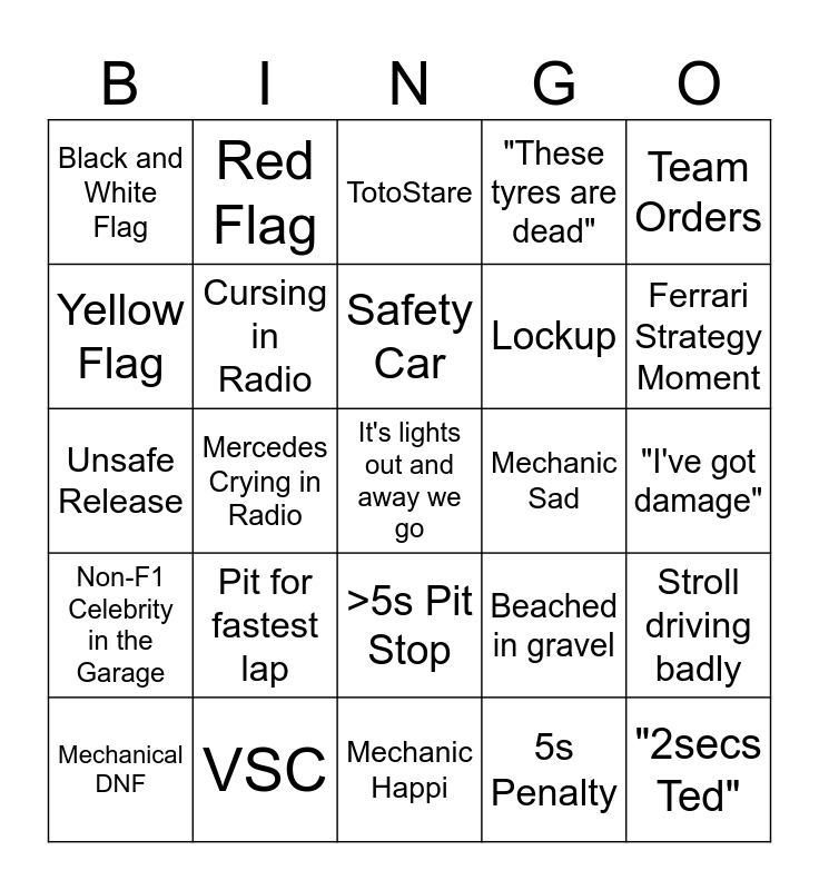 This bingo card has a free space and 26 words: >5s Pit Stop, 5s Penalty, Safety Car, VSC, Team Orders, Black and White Flag, Yellow Flag, Red Flag, "I've got damage", Beached in gravel, Lockup, Unsafe Release, Stroll driving badly, Mechanical DNF, Mercedes Crying in Radio, Crash, "These tyres are dead", Non-F1 Celebrity in the Garage, TotoStare, "2secs Ted", Ferrari Strategy Moment, Mechanic Happi, Mechanic Sad, Pit for fastest lap, Cursing in Radio and Rain.