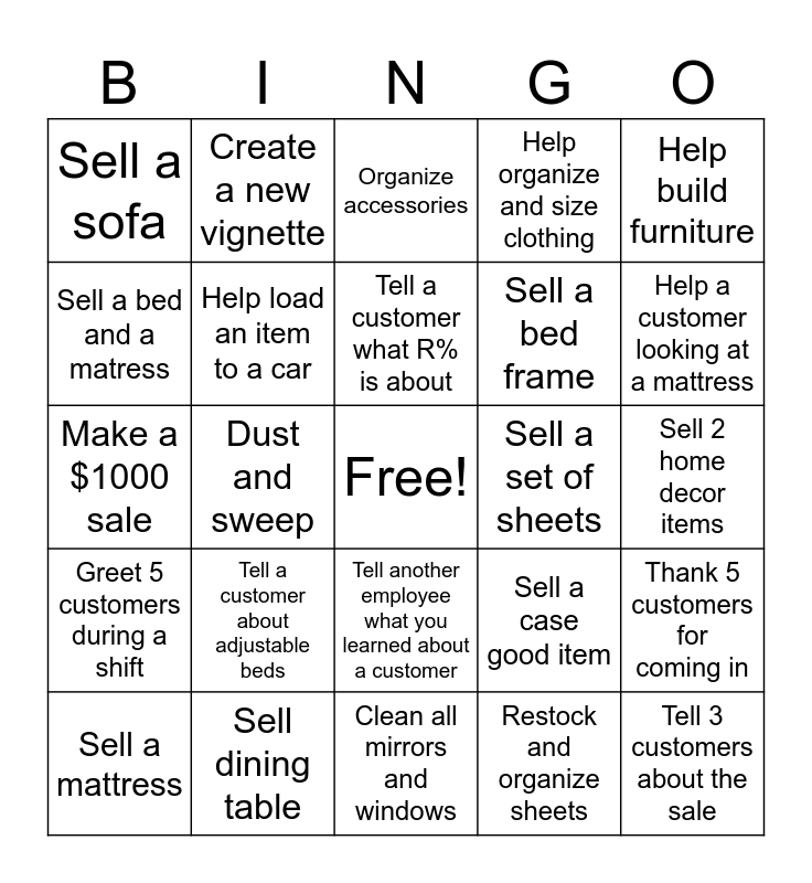This bingo card has a free space and 24 words: Tell a customer about adjustable beds, Sell dining table, Tell a customer what R% is about, Sell a mattress, Help build furniture, Sell a sofa, Sell a bed and a matress, Create a new vignette, Sell a set of sheets, Tell another employee what you learned about a customer, Sell a bed frame, Make a $1000 sale, Sell a case good item, Thank 5 customers for coming in, Help load an item to a car, Restock and organize sheets, Sell 2 home decor items, Organize accessories, Help a customer looking at a mattress, Dust and sweep, Tell 3 customers about the sale, Greet 5 customers during a shift, Help organize and size clothing and Clean all mirrors and windows.