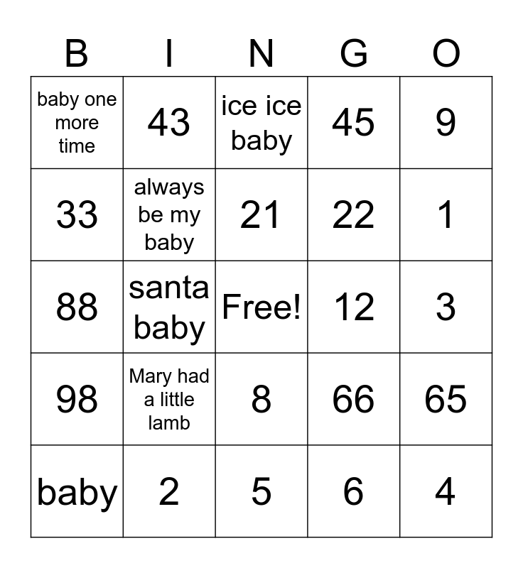 This bingo card has a free space and 29 words: baby, baby got back, santa baby, baa baa black sheep, baby one more time, ice ice baby, always be my baby, Mary had a little lamb, 12, 2, 3, 4, 5, 6, 1, 7, 8, 98, 9, 88, 66, 11, 22, 33, 45, 43, 65, 21 and 18.