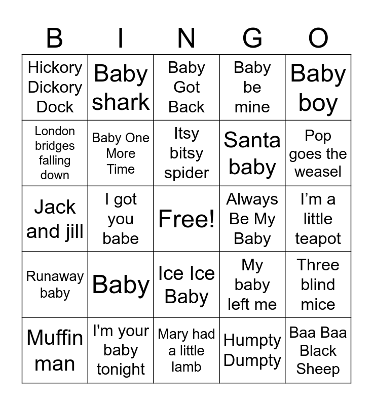 This bingo card has a free space and 30 words: I'm your baby tonight, Industry baby, I got you babe, Don't Worry baby, Hickory Dickory Dock, Baby Got Back, Baby One More Time, Ice Ice Baby, Always Be My Baby, Mary had a little lamb, I’m a little teapot, Baa Baa Black Sheep, Humpty Dumpty, Someone Else Calling You Baby, Pop goes the weasel, Wheels on the bus, My baby left me, Runaway baby, Baby, Baby boy, Jack and jill, If you’re happy and you know it, Baby shark, Santa baby, London bridges falling down, Baby be mine, Three blind mice, Muffin man, Itsy bitsy spider and Old mcdonald had a farm.