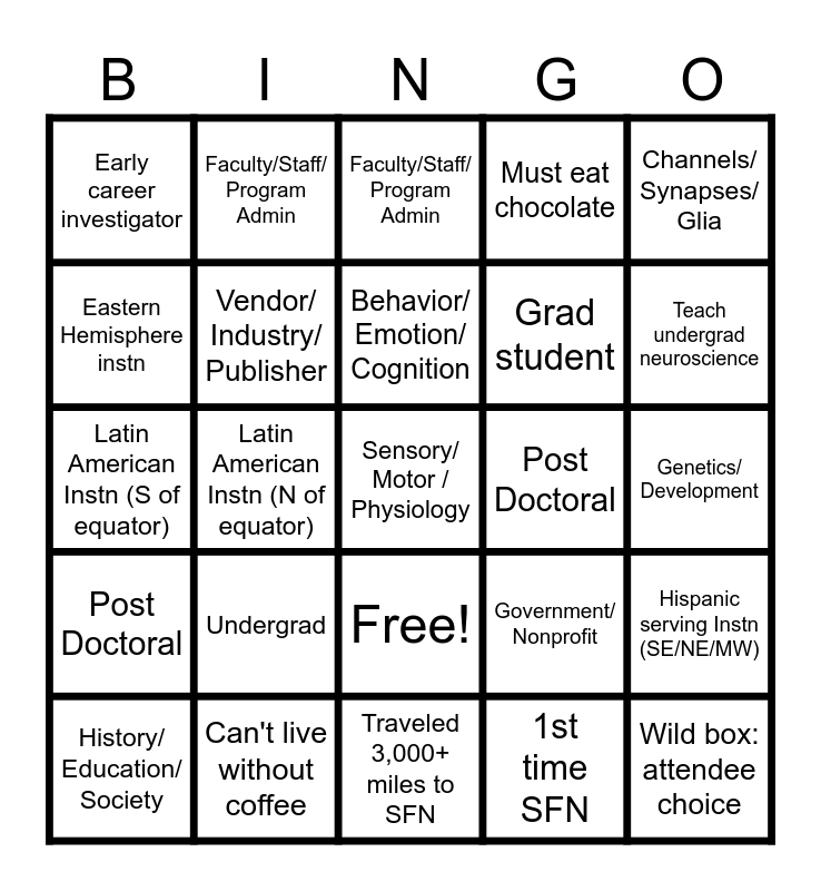 This bingo card has 26 words: Free!, 1st time SFN, Behavior/ Emotion/ Cognition, Can't live without coffee, Channels/ Synapses/ Glia, Early career investigator, Eastern Hemisphere instn, Faculty/Staff/ Program Admin, Genetics/ Development, Government/ Nonprofit, Grad student, Latin American Instn (S of equator), Hispanic serving Instn (SE/NE/MW), History/ Education/ Society, Latin American Instn (N of equator), Hispanic serving Instn (W/SW), Must eat chocolate, Post Doctoral, Faculty/Staff/ Program Admin, Sensory/ Motor / Physiology, Teach undergrad neuroscience, Traveled 3,000+ miles to SFN, Post Doctoral, Undergrad, Vendor/ Industry/ Publisher and Wild box: attendee choice.