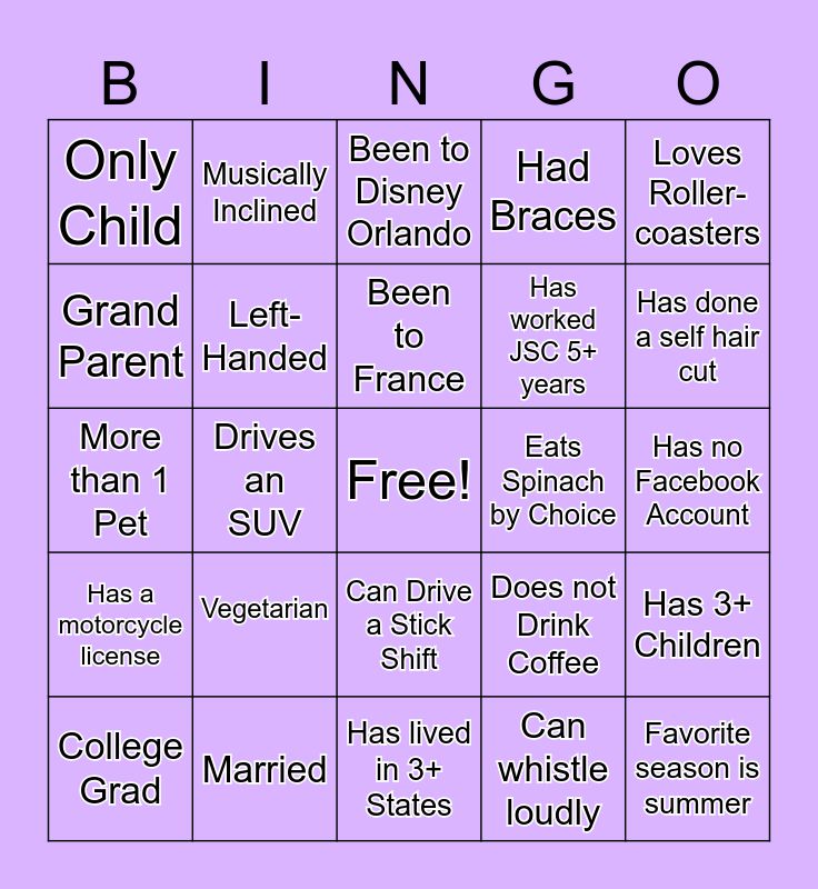 This bingo card has a free space and 24 words: Vegetarian, Married, Been to France, College Grad, Loves Roller-coasters, Only Child, Grand Parent, Musically Inclined, Eats Spinach by Choice, Can Drive a Stick Shift, Has worked JSC 5+ years, More than 1 Pet, Does not Drink Coffee, Has 3+ Children, Left-Handed, Can whistle loudly, Has no Facebook Account, Been to Disney Orlando, Has done a self hair cut, Drives an SUV, Favorite season is summer, Has a motorcycle license, Had Braces and Has lived in 3+ States.