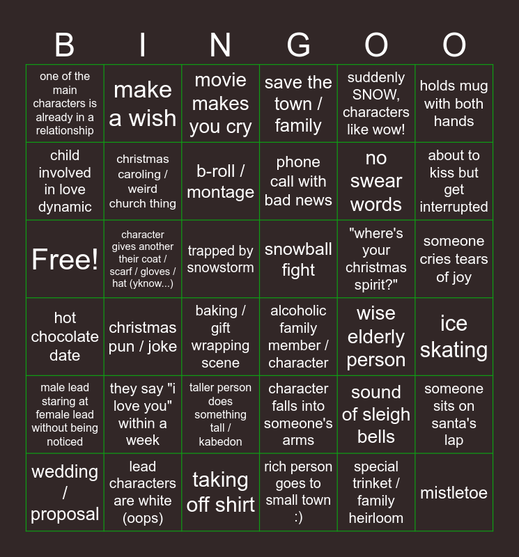 This bingo card has 36 words: character falls into someone's arms, taller person does something tall / kabedon, rich person goes to small town :), child involved in love dynamic, hot chocolate date, snowball fight, christmas caroling / weird church thing, taking off shirt, suddenly SNOW, characters like wow!, sound of sleigh bells, about to kiss but get interrupted, save the town / family, someone sits on santa's lap, character gives another their coat / scarf / gloves / hat (yknow...), phone call with bad news, one of the main characters is already in a relationship, male lead staring at female lead without being noticed, "where's your christmas spirit?", Free!, movie makes you cry, trapped by snowstorm, christmas pun / joke, alcoholic family member / character, baking / gift wrapping scene, wise elderly person, make a wish, no swear words, lead characters are white (oops), b-roll / montage, holds mug with both hands, mistletoe, wedding / proposal, ice skating, someone cries tears of joy, they say "i love you" within a week and special trinket / family heirloom.