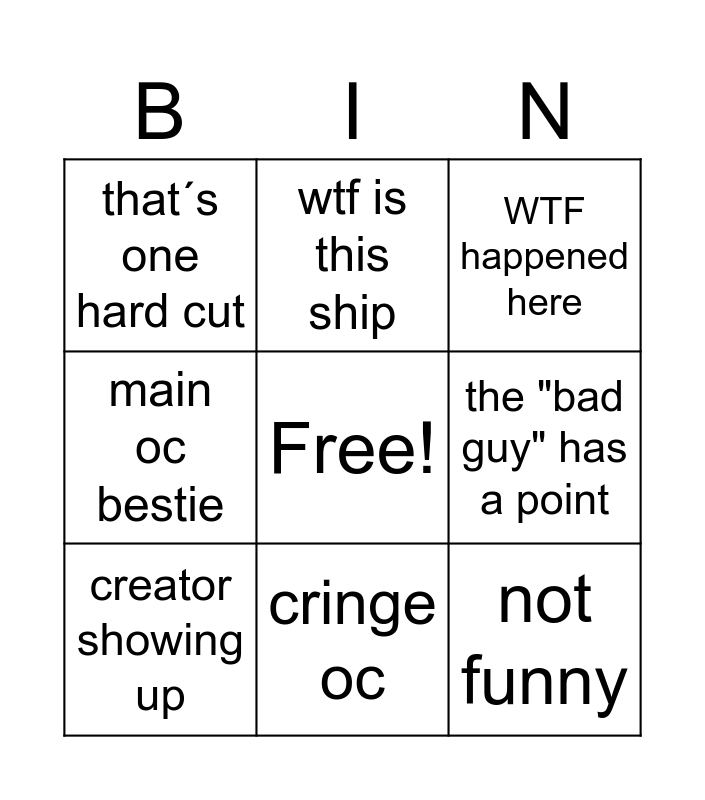 This bingo card has a free space and 15 words: Kinemaster, Cringe songs, WTF happened here, that´s one hard cut, cringe oc, not funny, W H Y D O YOU DO THAT, did the mom cheat?, the "bad guy" has a point, main story oc is weird, the alpha, main oc bestie, creator showing up, wtf is this ship and is that cheating.