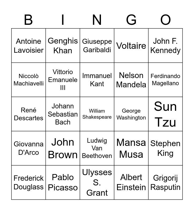 This bingo card has 101 words: Free!, Winston Churchill, John F. Kennedy, Franklin D. Roosevelt, Theodore Roosevelt, Harry Truman, Ronald Reagan, Steve Jobs, Benito Mussolini, Thomas Jefferson, Alexander Hamilton, Benjamin Franklin, Adolf Hitler, Hirohito, Josef Stalin, Vladimir Lenin, Giovanna D'Arco, Gandhi, Martin Luther King, Sigmund Freud, Cleopatra, Giulio Cesare, Friedrich Nietzsche, Aristotele, Bill Gates, Ferdinando Magellano, Voltaire, John Brown, Federico il Grande, Napoleone Bonaparte, Genghis Khan, Giuseppe Garibaldi, Dante Alighieri, Confucio, Wolfgang Amadeus Mozart, Ludwig Van Beethoven, Stephen Hawking, Mikhail Gorbachev, Albert Einstein, Ulysses S. Grant, Socrate, Frederick Douglass, Nikola Tesla, Enrico Fermi, Thomas Edison, William Shakespeare, Erwin Rommel, Cristoforo Colombo, Charles Darwin, Grigorij Rasputin, Johann Wolfgang von Goethe, Niccolò Machiavelli, Leonardo Da Vinci, Antonio Vivaldi, Giuseppe Verdi, Alfred Nobel, Galileo Galilei, Abraham Lincoln, Charles De Gaulle, Pietro Badoglio, Vittorio Emanuele III, Jackson Pollock, Maria Montessori, Malcolm X, Lazzaro Spallanzani, Nelson Mandela, Isaac Newton, Johann Sebastian Bach, Pablo Picasso, Vincent Van Gogh, Claude Monet, Frida Kahlo, Antoine Lavoisier, Edgar Allan Poe, Immanuel Kant, René Descartes, Alessandro Magno, Ivan il Terribile, Rosa Parks, Platone, Al Capone, Adam Smith, George Washington, Che Guevara, Fidel Castro, Guy Fawkes, Sun Tzu, Roald Amundsen, Henry Ford, Vlad Tepes, Mansa Musa, Otto Von Bismarck, Salvador Dalì, Karl Marx e Friedrich Engels, Mao Zedong, Stephen King, Marie Curie, Francisco Franco, Enrico VIII, Luigi XVI and Maria Antonietta.