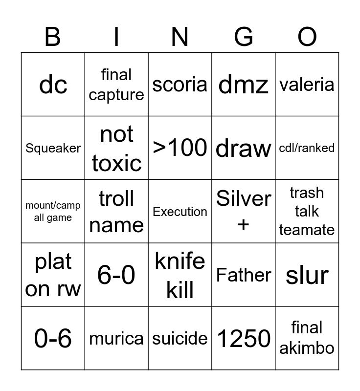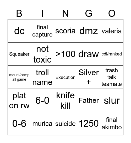 This bingo card has a free space and 24 words: 6-0, murica, >100, 0-6, valeria, dc, Squeaker, final capture, Silver +, knife kill, draw, mount/camp all game, Father, slur, not toxic, 1250, trash talk teamate, scoria, cdl/ranked, troll name, final akimbo, plat on rw, dmz and suicide.