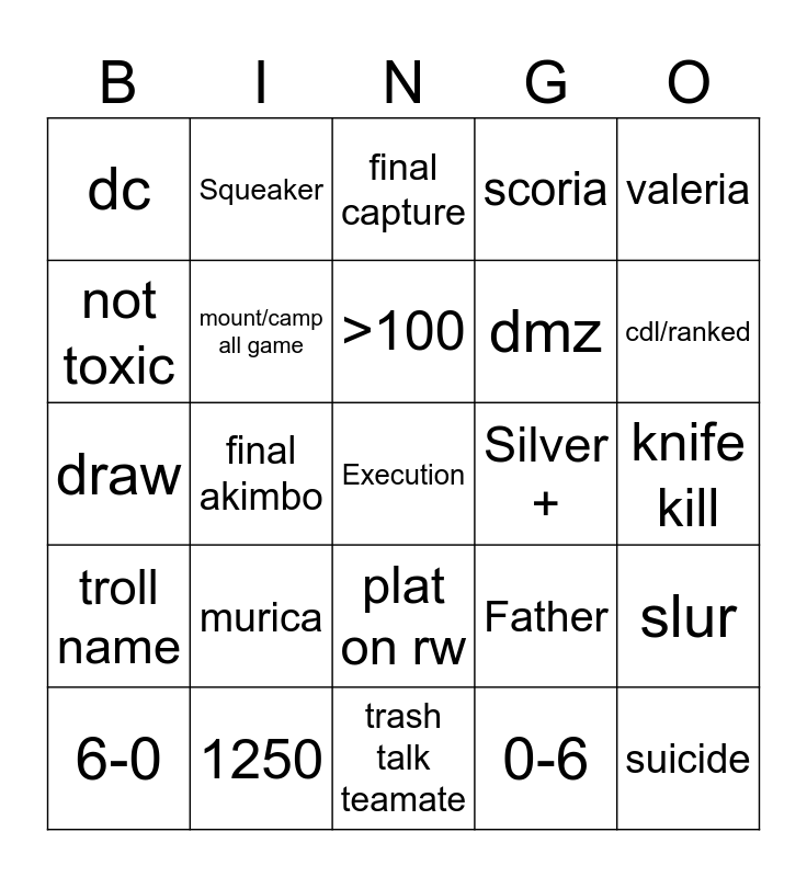 This bingo card has a free space and 24 words: 6-0, murica, >100, 0-6, valeria, dc, Squeaker, final capture, Silver +, knife kill, draw, mount/camp all game, Father, slur, not toxic, 1250, trash talk teamate, scoria, cdl/ranked, troll name, final akimbo, plat on rw, dmz and suicide.