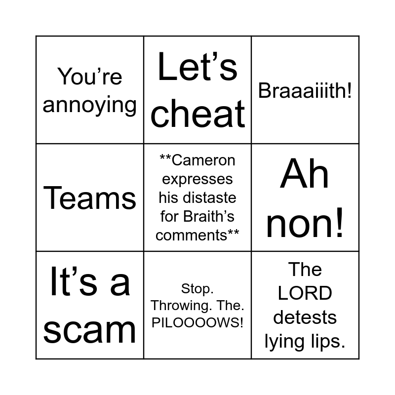 This bingo card has 27 words: Jail Chair, Judges, The LORD detests lying lips., Shush!, Ah non!, Braaaiiith!, Let’s cheat, Can we play poker, Shut uuuup!, Nooooooohhh!, **Talks about Cristian Studies Marks**, Teams, This is Grace’s bible, That’s a bit irritating, Hahahahahahahaaaahhah, These pillows smell like pee, It’s a scam, Stop. Throwing. The. PILOOOOWS!, Minecraft, You’re annoying, Or lack thereof, Braith if you don’t stop talking, Jump, **James G can’t stop laughing**, Stop trying to cheat, **Cameron expresses his distaste for Braith’s comments** and **James G makes a wierd pig snort laughing noise**.