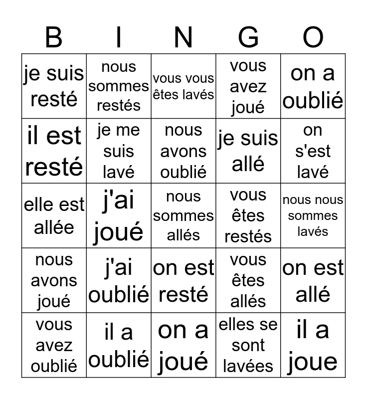 This bingo card has a free space and 24 words: j'ai oublié, il a oublié, nous avons oublié, vous avez oublié, on a oublié, je suis resté, il est resté, nous sommes restés, vous êtes restés, on est resté, je suis allé, elle est allée, vous êtes allés, on est allé, je me suis lavé, elles se sont lavées, nous nous sommes lavés, vous vous êtes lavés, on s'est lavé, j'ai joué, il a joue, nous avons joué, vous avez joué and on a joué.