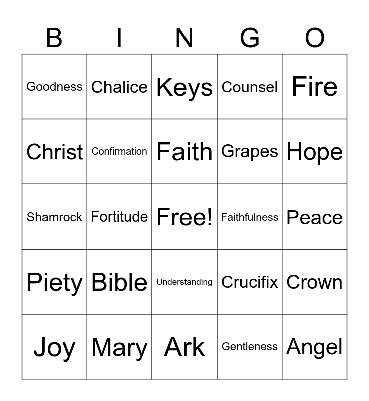 This bingo card has a free space and 51 words: Advent Wreath, Angel, Apple, Ark, Bible, Candle, Chalice, Chrism Oil, Christ, Church, Confirmation, Counsel, Crown, Crucifix, Dove, Eucharist, Faith, Faithfulness, Fear of the Lord, Fire, Fortitude, Gentleness, Goodness, Grapes, Harp, Holy Spirit, Hope, Horn, Joy, Keys, Kindness, Knowledge, Lamb, Lion, Love, Mary, Modesty, Monstrance, Palms, Patience, Peace, Piety, Pope, Resurrection, Saints, Self-Control, Shamrock, Slingshot, Star, Understanding and Wisdom.