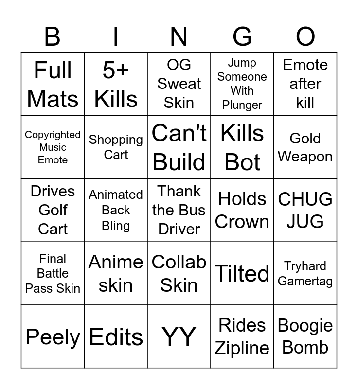 This bingo card has a free space and 24 words: Anime skin, Edits, Can't Build, Peely, Emote after kill, Full Mats, Copyrighted Music Emote, 5+ Kills, Holds Crown, Collab Skin, Kills Bot, Drives Golf Cart, Tilted, Tryhard Gamertag, Shopping Cart, Rides Zipline, CHUG JUG, OG Sweat Skin, Gold Weapon, Animated Back Bling, Boogie Bomb, Final Battle Pass Skin, Jump Someone With Plunger and YY.