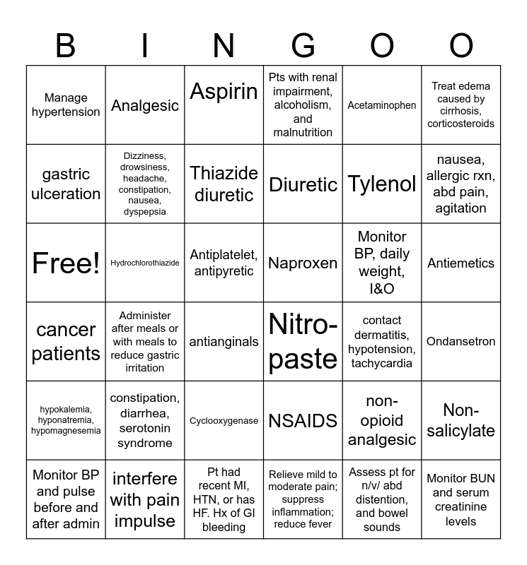 This bingo card has 36 words: NSAIDS, Cyclooxygenase, Relieve mild to moderate pain; suppress inflammation; reduce fever, gastric ulceration, cancer patients, Naproxen, Dizziness, drowsiness, headache, constipation, nausea, dyspepsia, Pt had recent MI, HTN, or has HF. Hx of GI bleeding, Acetaminophen, non-opioid analgesic, nausea, allergic rxn, abd pain, agitation, Pts with renal impairment, alcoholism, and malnutrition, Non-salicylate, Hydrochlorothiazide, Diuretic, Manage hypertension, hypokalemia, hyponatremia, hypomagnesemia, Monitor BP, daily weight, I&O, Free!, Aspirin, Antiplatelet, antipyretic, Administer after meals or with meals to reduce gastric irritation, Nitro-paste, antianginals, contact dermatitis, hypotension, tachycardia, Analgesic, Tylenol, interfere with pain impulse, Thiazide diuretic, Treat edema caused by cirrhosis, corticosteroids, Monitor BUN and serum creatinine levels, Monitor BP and pulse before and after admin, Ondansetron, Antiemetics, constipation, diarrhea, serotonin syndrome and Assess pt for n/v/ abd distention, and bowel sounds.