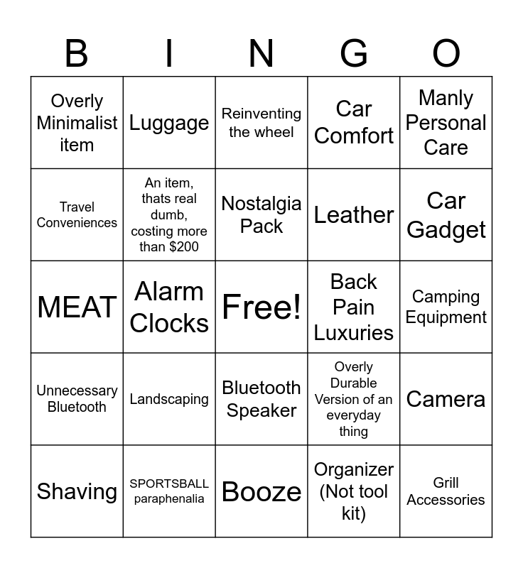 This bingo card has a free space and 49 words: Military Wannabe Paraphenalia, Grill Accessories, GOLF, Booze, Landscaping, Booze Containment Devices, Luggage, "Smoked", Travel Conveniences, Bath Accessories, An item, thats real dumb, costing more than $200, Car Comfort, Camera, Overly Durable Version of an everyday thing, Knives, Manly version of kitchen equiptment, Nostalgia Pack, Back Pain Luxuries, Power tools, Manly Personal Care, Alarm Clocks, Organizer (Not tool kit), Overly Minimalist item, Leather, Man Smells, Car Gadget, Shaving, DRONE/ RC, Bluetooth Speaker, Unnecessary Bluetooth, Mini Fridge, Coffee, Bad Acquired Tastes, Watches, SPORTSBALL paraphenalia, Tie paraphenalia, Garage, Tool Kit, Camping Equipment, GUN, Magnets, "For Men", Paranoia, Weird 2 in 1, MEAT, Reinventing the wheel, Penis Pun, BOAT and Fire.