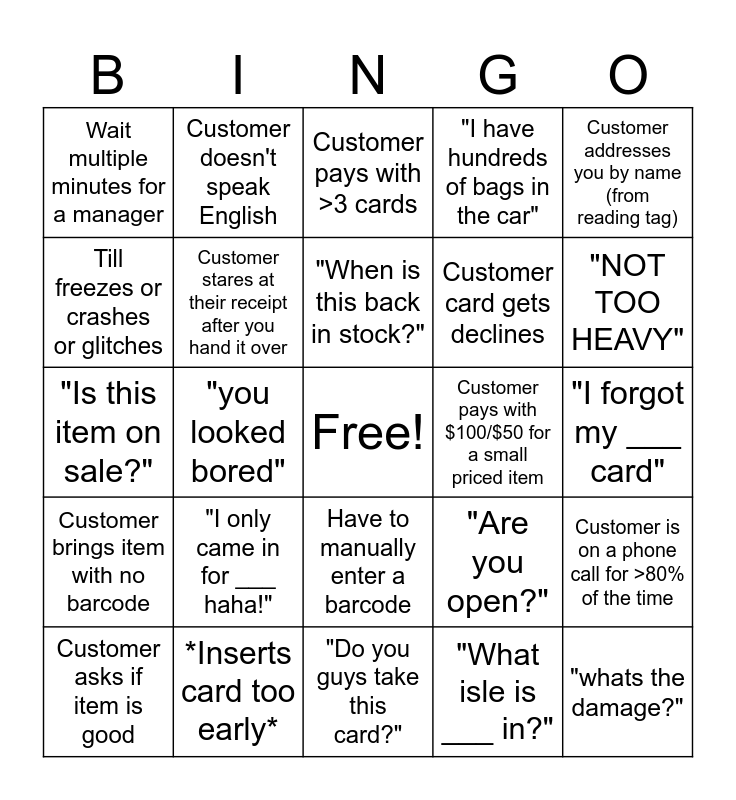 This bingo card has a free space and 24 words: "I only came in for ___ haha!", *Inserts card too early*, "When is this back in stock?", Customer asks if item is good, Customer addresses you by name (from reading tag), Wait multiple minutes for a manager, Till freezes or crashes or glitches, Customer doesn't speak English, Customer pays with $100/$50 for a small priced item, Have to manually enter a barcode, Customer card gets declines, "Is this item on sale?", "Are you open?", Customer is on a phone call for >80% of the time, Customer stares at their receipt after you hand it over, "What isle is ___ in?", "I forgot my ___ card", Customer pays with >3 cards, "NOT TOO HEAVY", "you looked bored", "whats the damage?", Customer brings item with no barcode, "I have hundreds of bags in the car" and "Do you guys take this card?".