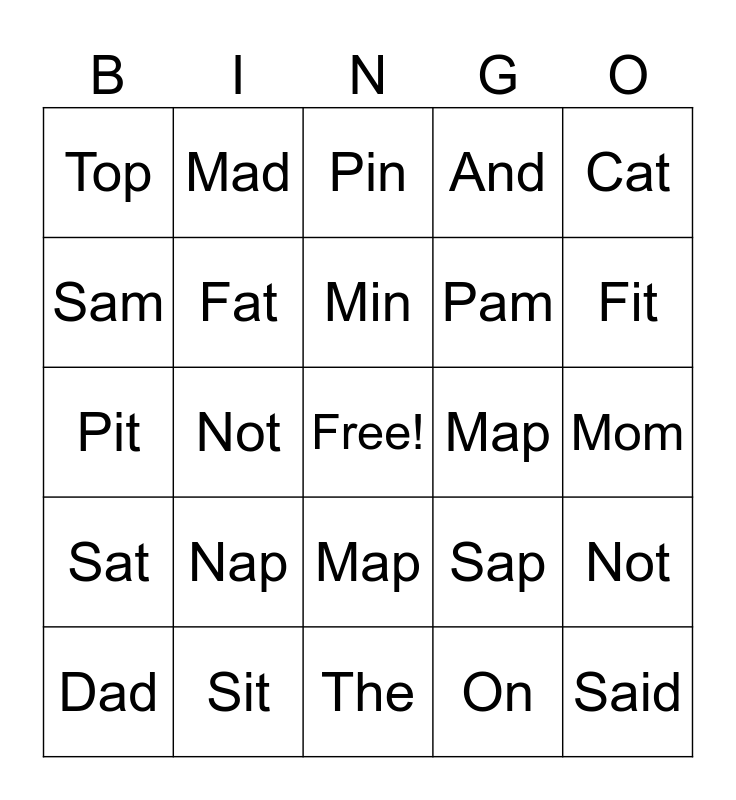 This bingo card has a free space and 34 words: Not, On, Cat, Mat, Sat, Fat, Cat, Dad, Mad, Sad, Min, Pin, Tin, The, Map, Fit, Sit, Pit, Nap, Sap, Map, Mop, Top, Mom, The, Said, And, Am, Pam, Sam, Not, Not, Not and Not.