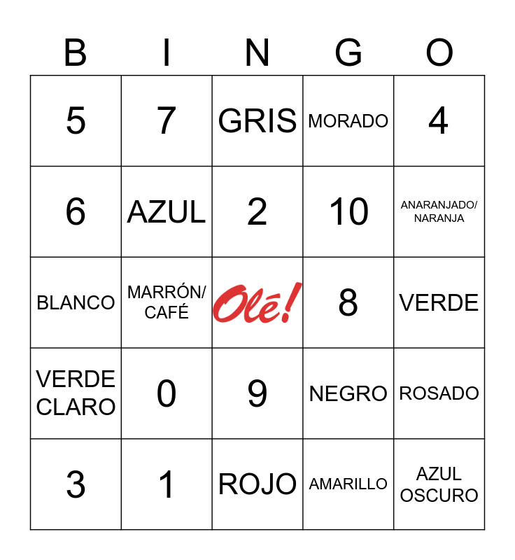 This bingo card has a free space and 24 words: 0, 1, 2, 3, 4, 5, 6, 7, 8, 9, 10, BLANCO, NEGRO, ROSADO, AZUL, AMARILLO, VERDE, GRIS, ANARANJADO/ NARANJA, MARRÓN/ CAFÉ, AZUL OSCURO, VERDE CLARO, MORADO and ROJO.