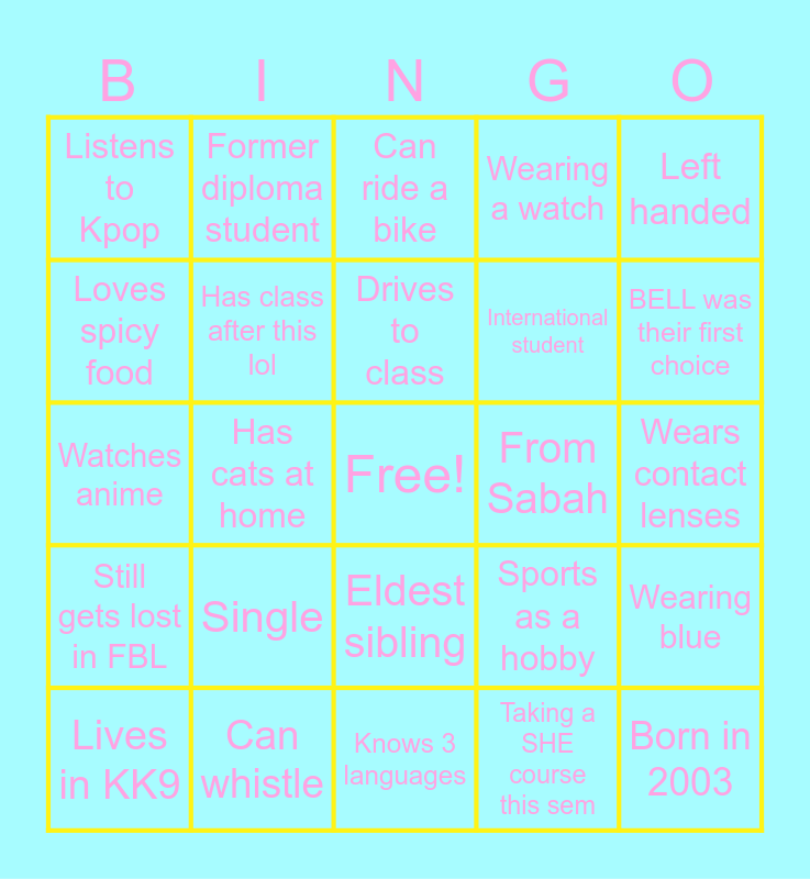 This bingo card has a free space and 25 words: Single, Knows 3 languages, Drives to class, Lives in KK9, Left handed, Listens to Kpop, Loves spicy food, Former diploma student, From Sabah, Eldest sibling, International student, Watches anime, Sports as a hobby, Wearing blue, Has class after this lol, Born in November, Wears contact lenses, Can ride a bike, BELL was their first choice, Has cats at home, Born in 2003, Can whistle, Still gets lost in FBL, Wearing a watch and Taking a SHE course this sem.
