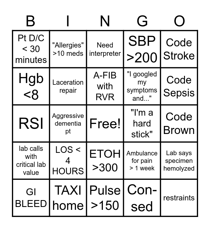 This bingo card has a free space and 24 words: LOS < 4 HOURS, TAXI home, A-FIB with RVR, GI BLEED, Code Stroke, Pt D/C < 30 minutes, Hgb <8, "Allergies" >10 meds, "I'm a hard stick", ETOH >300, "I googled my symptoms and...", RSI, Ambulance for pain > 1 week, Lab says specimen hemolyzed, Laceration repair, Con-sed, Code Brown, Need interpreter, Code Sepsis, Aggressive dementia pt, restraints, lab calls with critical lab value, SBP >200 and Pulse >150.