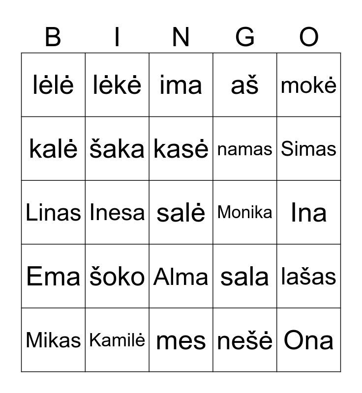 This bingo card has a free space and 24 words: šoko, Kamilė, kasė, Mikas, mokė, lėlė, kalė, lėkė, Monika, Alma, namas, Linas, sala, lašas, šaka, nešė, Ina, ima, Simas, Inesa, Ona, Ema, aš and mes.