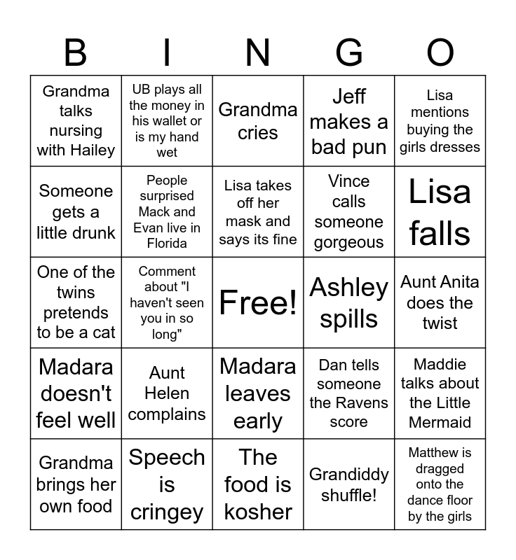 This bingo card has a free space and 24 words: Aunt Helen complains, Speech is cringey, Lisa takes off her mask and says its fine, Grandma brings her own food, Lisa mentions buying the girls dresses, Grandma talks nursing with Hailey, Someone gets a little drunk, UB plays all the money in his wallet or is my hand wet, Ashley spills, Madara leaves early, Vince calls someone gorgeous, One of the twins pretends to be a cat, Dan tells someone the Ravens score, Maddie talks about the Little Mermaid, People surprised Mack and Evan live in Florida, Grandiddy shuffle!, Aunt Anita does the twist, Grandma cries, Lisa falls, Comment about "I haven't seen you in so long", Matthew is dragged onto the dance floor by the girls, Madara doesn't feel well, Jeff makes a bad pun and The food is kosher.