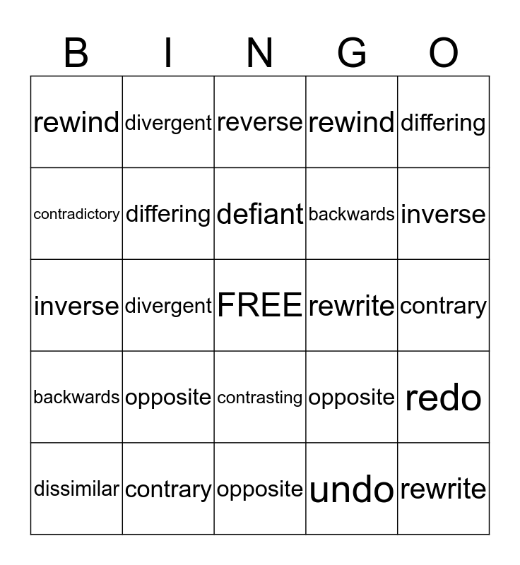 ⚠ This card has duplicate items: opposite (3), contrary (2), differing (2), rewind (2), divergent (2), rewrite (2), backwards (2), inverse (2)