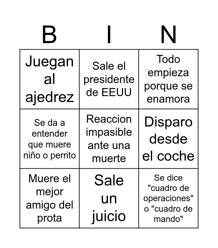 This bingo card has a free space and 8 words: Disparo desde el coche, Todo empieza porque se enamora, Sale el presidente de EEUU, Muere el mejor amigo del prota, Juegan al ajedrez, Se dice "cuadro de operaciones" o "cuadro de mando", Se da a entender que muere niño o perrito and Sale un juicio.