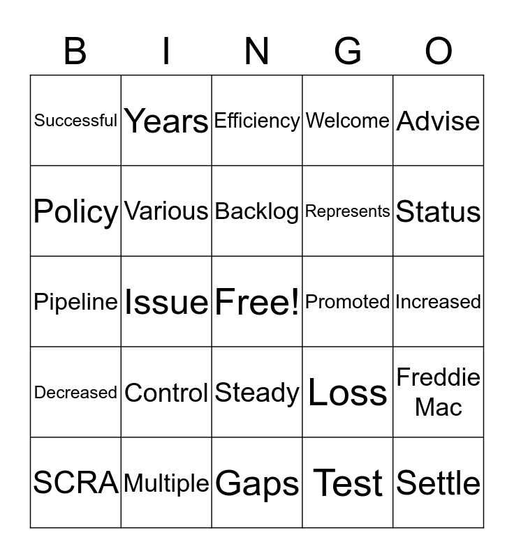 This bingo card has a free space and 24 words: Control, Multiple, Backlog, SCRA, Advise, Successful, Policy, Years, Promoted, Steady, Represents, Pipeline, Loss, Freddie Mac, Various, Test, Increased, Efficiency, Status, Issue, Settle, Decreased, Welcome and Gaps.