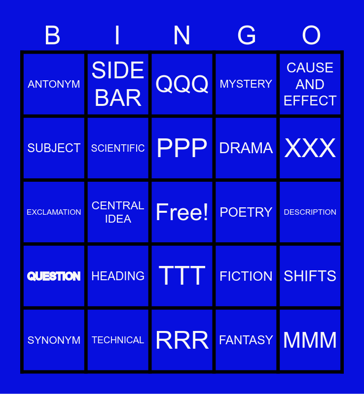 This bingo card has a free space and 24 words: SYNONYM, HEADING, PPP, FANTASY, CAUSE AND EFFECT, ANTONYM, SIDE BAR, QQQ, POETRY, DESCRIPTION, EXCLAMATION, SCIENTIFIC, FICTION, SHIFTS, SUBJECT, TECHNICAL, RRR, MYSTERY, XXX, QUESTION, CENTRAL IDEA, TTT, DRAMA and MMM.
