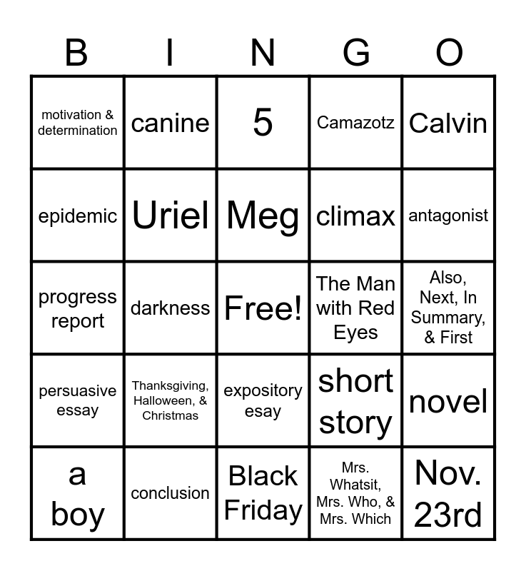 This bingo card has a free space and 47 words: Nov. 10th, Nov. 23rd, Iron Bowl, Black Friday, Thanksgiving, Halloween, & Christmas, abode, canine, wary, epidemic, IT, Uriel, Camazotz, novel, short story, CENTRAL Central Intelligence Building, Mr. Murry, Meg, The Man with Red Eyes, Charles Wallace, Calvin, darkness, Mrs. Whatsit, Mrs. Who, & Mrs. Which, motivation & determination, climax, protagonist, antagonist, a boy, rising action, expository esay, persuasive essay, narrative essay, hook, thesis, introduction, body, conclusion, Also, Next, In Summary, & First, topic sentence, evidence, commentary, closing, 5, progress report, PBS, BFF, T.G.I.F. and basketball.