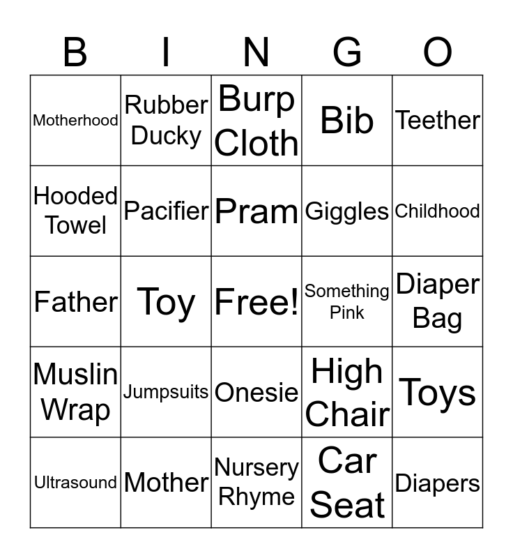 This bingo card has a free space and 37 words: Baby, Bottle, Milk, Pacifier, Toys, Jumpsuits, Pram, Formula, Teether, Rattle, Toy, Bib, Diapers, Diaper Bag, Hooded Towel, Muslin Wrap, Baby Powder, Burp Cloth, Onesie, Something Pink, Motherhood, Childhood, Ultrasound, Nursery Rhyme, Changing Table, Car Seat, Rubber Ducky, Bottle Warmer, Wet Wipes, Adorable, Baby Talk, Mother, Father, Parenthood, High Chair, Giggles and Nap Time.