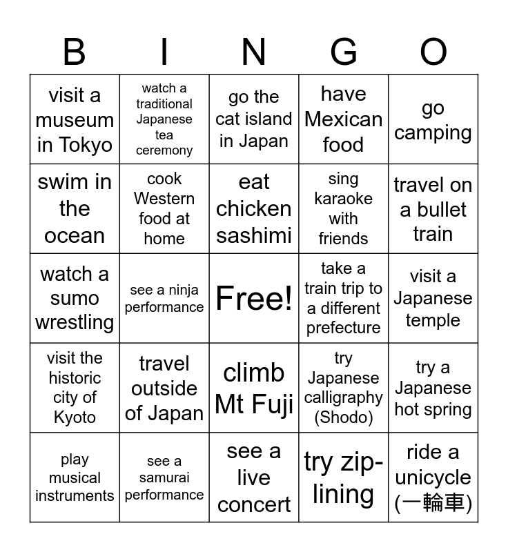 This bingo card has a free space and 25 words: travel outside of Japan, see a live concert, eat chicken sashimi, play musical instruments, go camping, visit a museum in Tokyo, swim in the ocean, watch a traditional Japanese tea ceremony, take a train trip to a different prefecture, climb Mt Fuji, sing karaoke with friends, watch a sumo wrestling, try Japanese calligraphy (Shodo), try a Japanese hot spring, cook Western food at home, wear a kimono, visit a Japanese temple, go the cat island in Japan, travel on a bullet train, see a ninja performance, ride a unicycle (一輪車), see a samurai performance, visit the historic city of Kyoto, have Mexican food and try zip-lining.