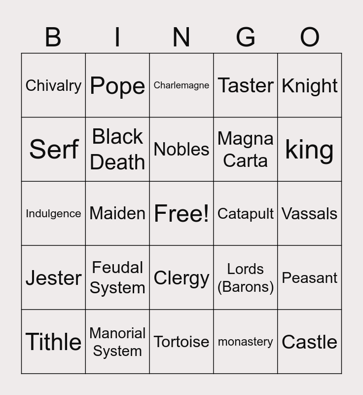 This bingo card has a free space and 24 words: Feudal System, Manorial System, Nobles, Tithle, Knight, Chivalry, Serf, Pope, Catapult, Clergy, Magna Carta, Indulgence, Lords (Barons), Peasant, Black Death, monastery, Vassals, Charlemagne, king, Maiden, Castle, Jester, Taster and Tortoise.