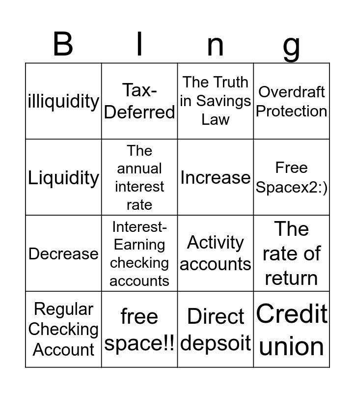 This bingo card has a free space and 20 words: The rate of return, Compound-ing, The Truth in Savings Law, The annual perecentage yeild, Regular Checking Account, Liquidity, free space!!, illiquidity, Decrease, Tax-Deferred, Interest-Earning checking accounts, Credit union, The annual interest rate, The Federal Reserve System, Increase, Debit Card, Free Spacex2:), Overdraft Protection, Direct depsoit and Certificate of Deposit.