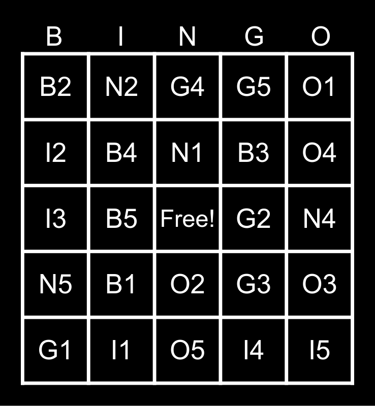 This bingo card has a free space and 24 words: B1, I1, N1, G1, O1, B2, I2, N2, G2, O2, B3, I3, G3, O3, B4, I4, N4, G4, O4, B5, I5, N5, G5 and O5.