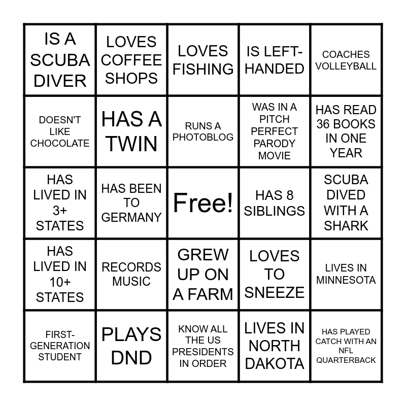 This bingo card has a free space and 57 words: TUBA PLAYER, FIRST-GENERATION STUDENT, HAS ATTENDED A NATIONAL ARCHERY TOURNAMENT, IS A SCUBA DIVER, KNOW ALL THE US PRESIDENTS IN ORDER, HOLDS A WORLD GUINNESS RECORD, HAS A TWIN, LOVES DONUTS, WAS IN A PITCH PERFECT PARODY MOVIE, WORKED AS A CHEF FOR 10 YEARS, IS LEFT-HANDED, FROM THE BAHAMAS, GETTING MARRIED IN 2024, TASTED OVER 40 DIFFERENT OREO FLAVORS, HAS A CAT NAMED NOODLES, BEEN TO 46 STATES, COACHES VOLLEYBALL, HAS BEEN TO GERMANY, GALLUP-CERTIFIED STRENGTHS COACH, HAS PLAYED CATCH WITH AN NFL QUARTERBACK, HAS 8 SIBLINGS, LIVED IN BRAZIL, LOVES TO SNEEZE, LOVES FISHING, GONE SKYDIVING, RUNS A PHOTOBLOG, HAS A DOG NAMED MCGEE, FAVORITE BOOK IS THE COLOR PURPLE, HAS READ 36 BOOKS IN ONE YEAR, KNOWS EVERY STATE AND CAPITAL, COLLECTS POTATO HEADS, LOVES VIDEO GAMES, WORKED FOR THE CHICAGO BEARS, HAS 10 SIBLINGS, SCUBA DIVED WITH A SHARK, DOESN'T LIKE CHOCOLATE, IS A STRING BASE, HAS LIVED IN 3+ STATES, HAS LIVED IN 5+ STATES, HAS LIVED IN 10+ STATES, LOVES COFFEE SHOPS, GREW UP ON A FARM, WAS IN A MOVIE THAT AIRED ON PBS, LOVES LAW AND ORDER SVU, HAS HELD A KOALA, HAS A PARTNER ALSO ON THE UMR COMMITTEE, RECORDS MUSIC, PLAYS DND, LIVES IN KANSAS, LIVES IN NEBRASKA, LIVES IN SOUTH DAKOTA, LIVES IN NORTH DAKOTA, LIVES IN IOWA, LIVES IN MISSOURI, LIVES IN WISCONSIN, LIVES IN MINNESOTA and LIVES IN ILLINOIS.