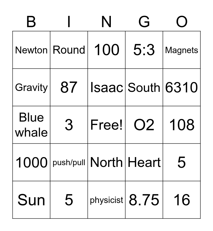 This bingo card has a free space and 25 words: push/pull, physicist, Isaac, Sun, Magnets, Newton, Gravity, Round, O2, North, South, Blue whale, Heart, 5, 87, 75, 108, 100, 6310, 3, 16, 5, 1000, 5:3 and 8.75.