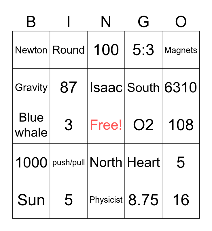 This bingo card has a free space and 25 words: push/pull, Physicist, Isaac, Sun, Magnets, Newton, Gravity, Round, O2, North, South, Blue whale, Heart, 5, 87, 75, 108, 100, 6310, 3, 16, 5, 1000, 5:3 and 8.75.