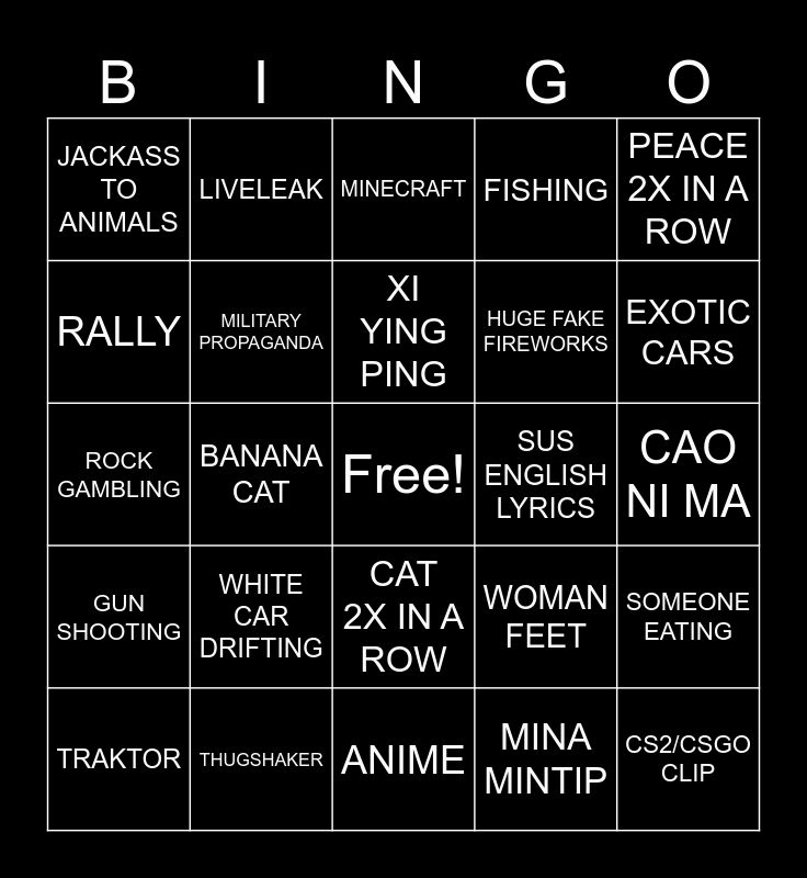 This bingo card has a free space and 24 words: WHITE CAR DRIFTING, THUGSHAKER, XI YING PING, TRAKTOR, PEACE 2X IN A ROW, JACKASS TO ANIMALS, RALLY, LIVELEAK, SUS ENGLISH LYRICS, CAT 2X IN A ROW, HUGE FAKE FIREWORKS, ROCK GAMBLING, WOMAN FEET, SOMEONE EATING, MILITARY PROPAGANDA, MINA MINTIP, CAO NI MA, MINECRAFT, EXOTIC CARS, BANANA CAT, CS2/CSGO CLIP, GUN SHOOTING, FISHING and ANIME.