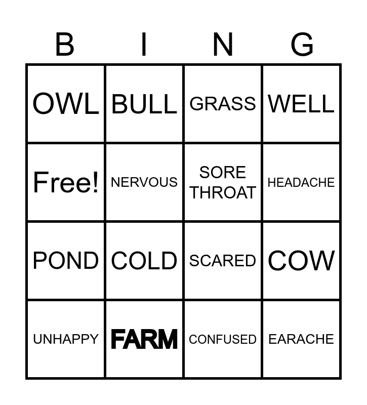 This bingo card has 16 words: FARM, COW, GRASS, OWL, POND, BULL, SCARED, CONFUSED, Free!, NERVOUS, UNHAPPY, WELL, COLD, HEADACHE, SORE THROAT and EARACHE.