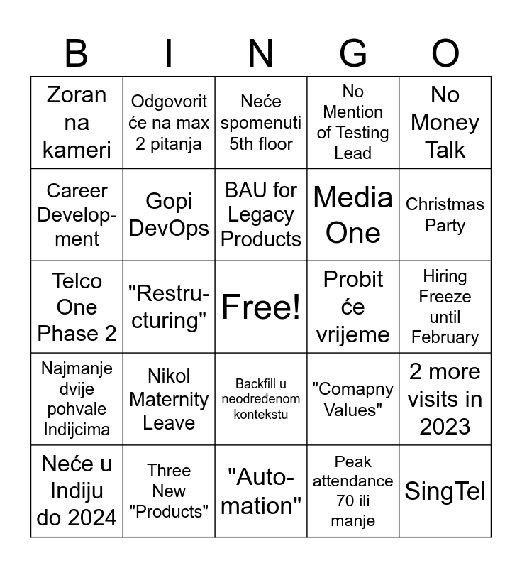 This bingo card has a free space and 24 words: Nikol Maternity Leave, Three New "Products", BAU for Legacy Products, Neće u Indiju do 2024, No Money Talk, Zoran na kameri, Career Develop-ment, Odgovorit će na max 2 pitanja, Probit će vrijeme, Backfill u neodređenom kontekstu, Media One, Telco One Phase 2, "Comapny Values", 2 more visits in 2023, Gopi DevOps, Peak attendance 70 ili manje, Hiring Freeze until February, Neće spomenuti 5th floor, Christmas Party, "Restru-cturing", SingTel, Najmanje dvije pohvale Indijcima, No Mention of Testing Lead and "Auto-mation".