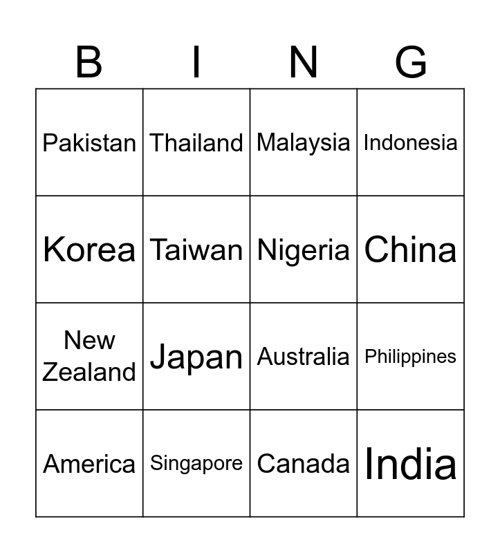 This bingo card has 16 words: Singapore, Philippines, Malaysia, Pakistan, New Zealand, Thailand, Australia, Canada, Korea, Taiwan, America, Indonesia, Japan, China, Nigeria and India.