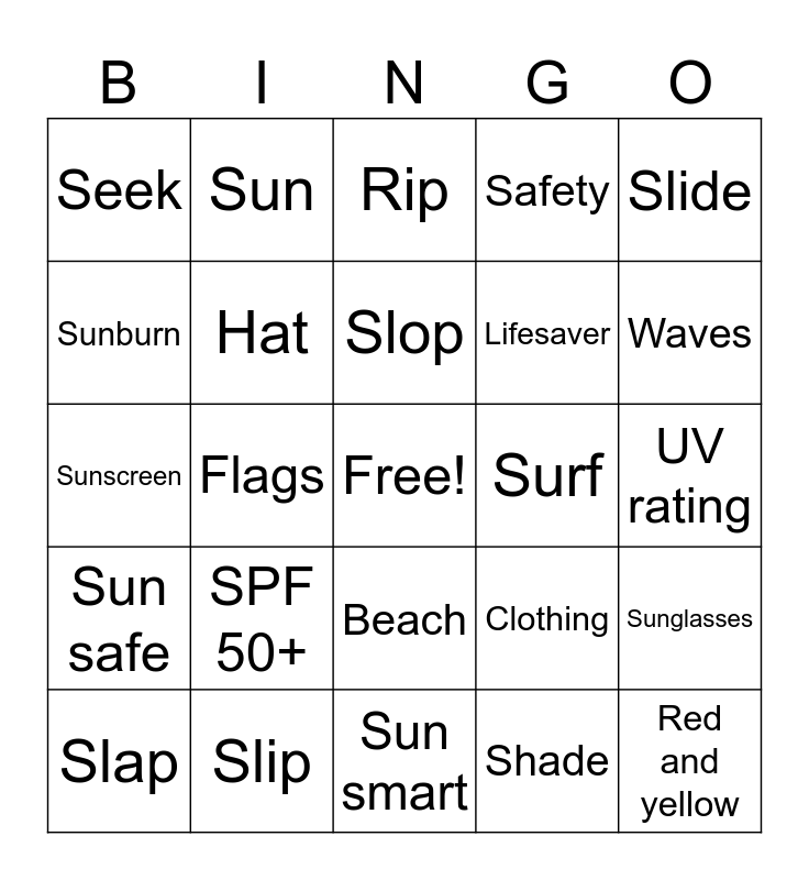 This bingo card has a free space and 24 words: SPF 50+, Slip, Slop, Slap, Slide, Seek, Sunburn, Sun, Surf, Beach, Lifesaver, Sunscreen, Clothing, Sunglasses, Hat, Shade, UV rating, Rip, Waves, Flags, Red and yellow, Sun safe, Safety and Sun smart.