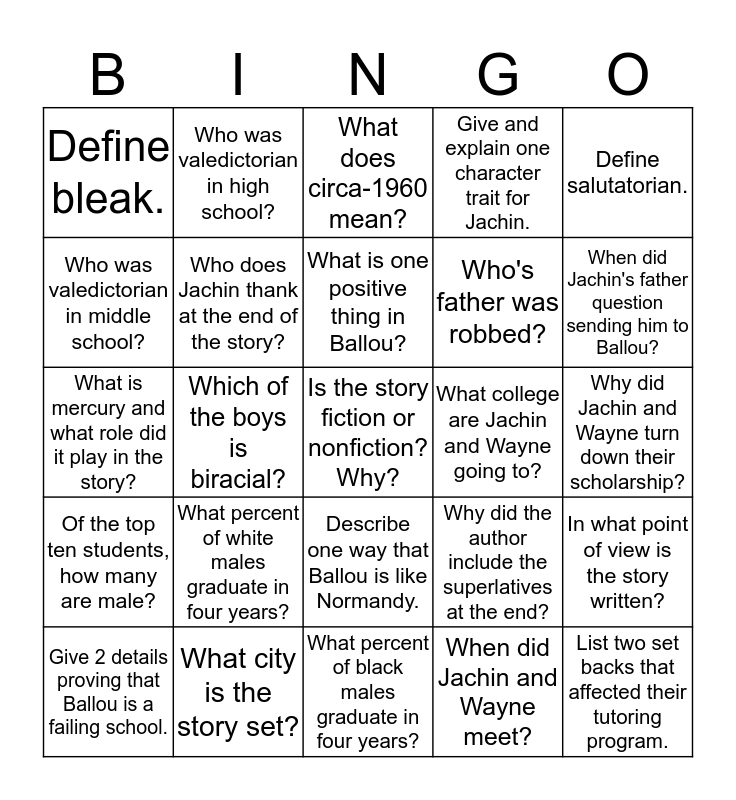 This bingo card has a free space and 24 words: What percent of white males graduate in four years?, What city is the story set?, What is one positive thing in Ballou?, Give 2 details proving that Ballou is a failing school., Define salutatorian., Define bleak., Who was valedictorian in middle school?, Who was valedictorian in high school?, What college are Jachin and Wayne going to?, Describe one way that Ballou is like Normandy., Who's father was robbed?, What is mercury and what role did it play in the story?, Why did the author include the superlatives at the end?, In what point of view is the story written?, Who does Jachin thank at the end of the story?, When did Jachin and Wayne meet?, Why did Jachin and Wayne turn down their scholarship?, What does circa-1960 mean?, When did Jachin's father question sending him to Ballou?, Which of the boys is biracial?, List two set backs that affected their tutoring program., Of the top ten students, how many are male?, Give and explain one character trait for Jachin. and What percent of black males graduate in four years?.