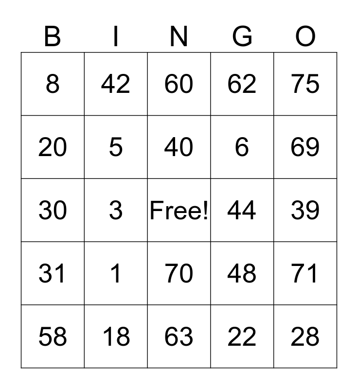 This bingo card has a free space and 24 words: 1, 18, 40, 58, 75, 8, 20, 42, 44, 70, 6, 30, 48, 71, 5, 22, 39, 60, 69, 3, 28, 31, 62 and 63.