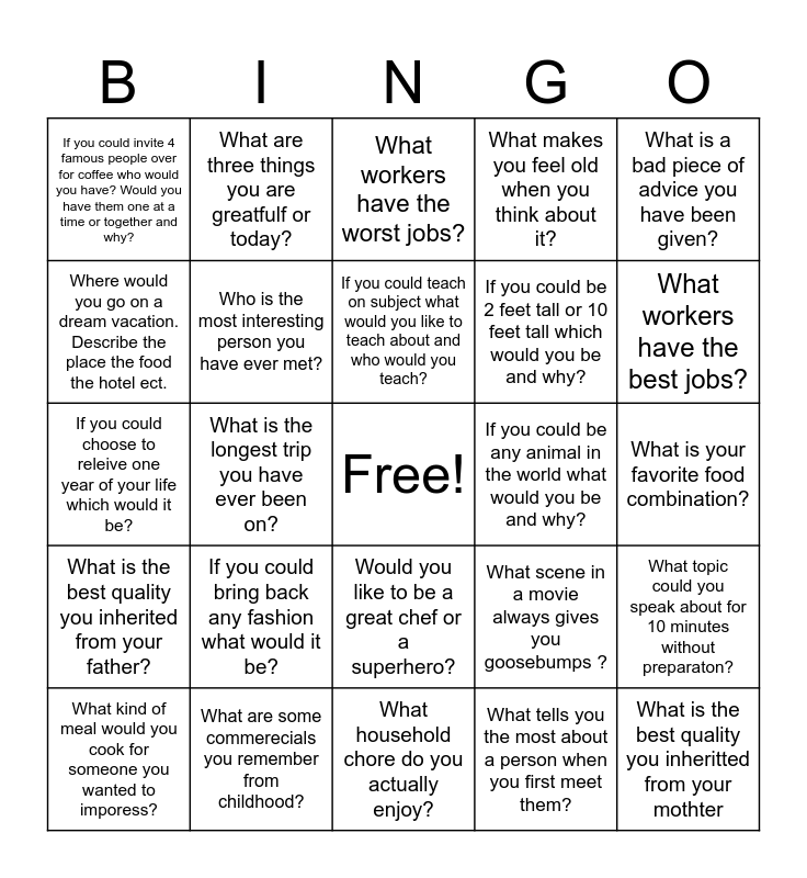 This bingo card has a free space and 24 words: If you could bring back any fashion what would it be?, What are some commerecials you remember from childhood?, If you could teach on subject what would you like to teach about and who would you teach?, What kind of meal would you cook for someone you wanted to imporess?, What is a bad piece of advice you have been given?, If you could invite 4 famous people over for coffee who would you have? Would you have them one at a time or together and why?, Where would you go on a dream vacation. Describe the place the food the hotel ect., What are three things you are greatfulf or today?, If you could be any animal in the world what would you be and why?, Would you like to be a great chef or a superhero?, If you could be 2 feet tall or 10 feet tall which would you be and why?, If you could choose to releive one year of your life which would it be?, What scene in a movie always gives you goosebumps ?, What topic could you speak about for 10 minutes without preparaton?, Who is the most interesting person you have ever met?, What tells you the most about a person when you first meet them?, What is your favorite food combination?, What workers have the worst jobs?, What workers have the best jobs?, What is the longest trip you have ever been on?, What is the best quality you inheritted from your mothter, What is the best quality you inherited from your father?, What makes you feel old when you think about it? and What household chore do you actually enjoy?.