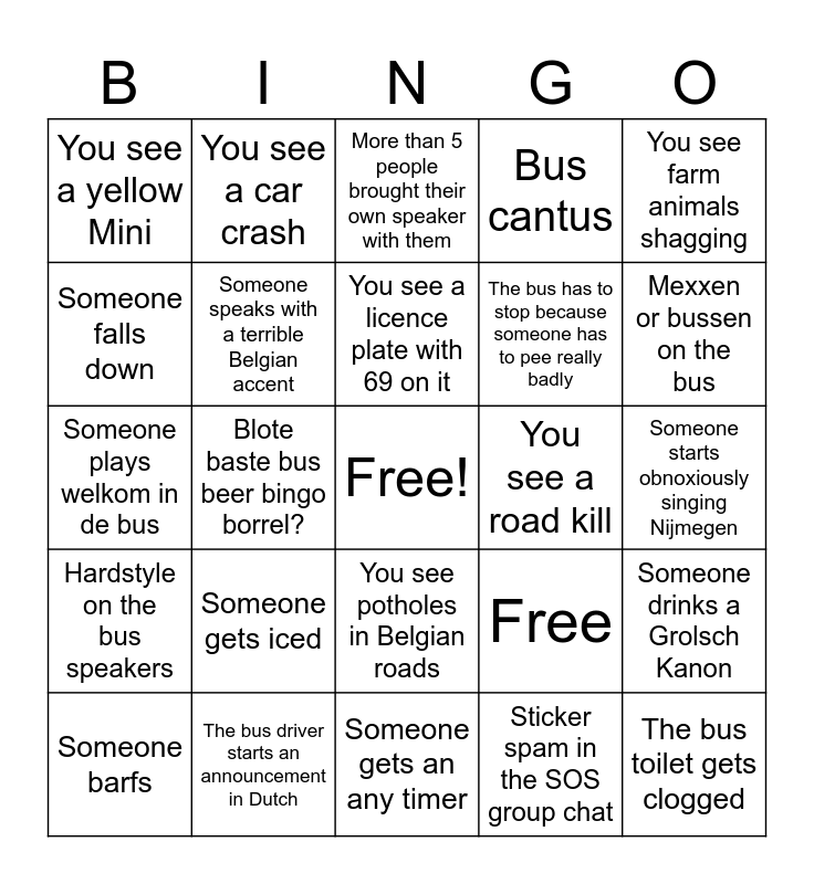 This bingo card has a free space and 25 words: Someone gets iced, Someone gets an any timer, You see a licence plate with 69 on it, Someone barfs, You see farm animals shagging, You see a yellow Mini, Someone falls down, You see a car crash, You see a road kill, You see potholes in Belgian roads, The bus has to stop because someone has to pee really badly, Someone plays welkom in de bus, Free, Someone drinks a Grolsch Kanon, Someone speaks with a terrible Belgian accent, Someone spills a drink on themselves, Someone starts obnoxiously singing Nijmegen, More than 5 people brought their own speaker with them, Mexxen or bussen on the bus, Blote baste bus beer bingo borrel?, The bus toilet gets clogged, The bus driver starts an announcement in Dutch, Hardstyle on the bus speakers, Bus cantus and Sticker spam in the SOS group chat.