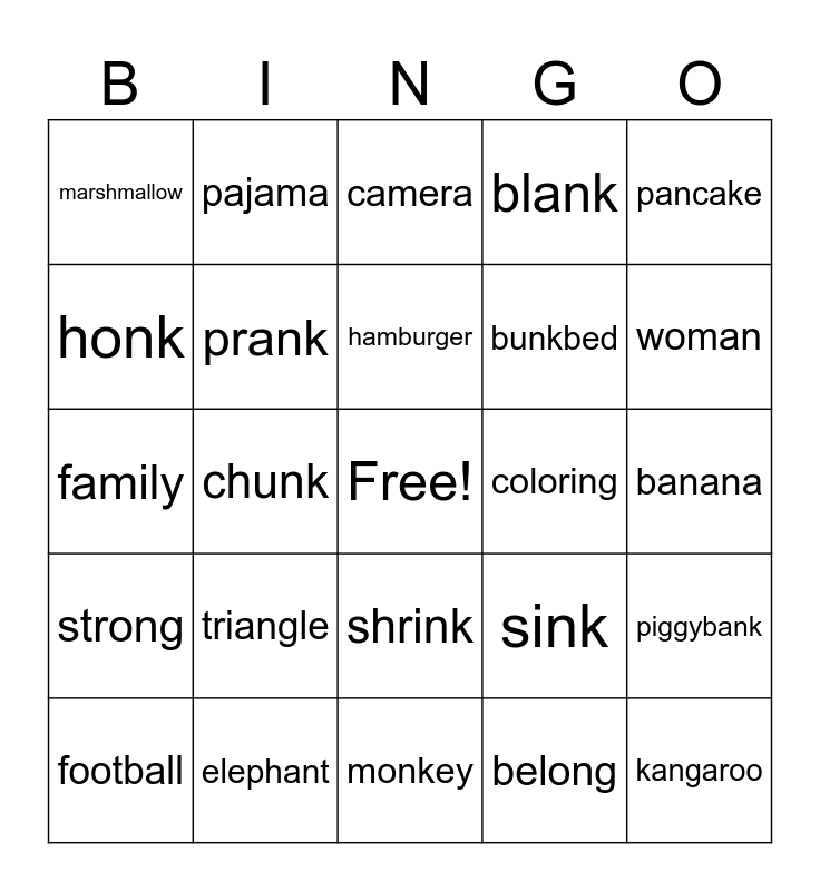 This bingo card has a free space and 24 words: triangle, elephant, hamburger, football, pancake, marshmallow, honk, pajama, coloring, shrink, bunkbed, family, sink, piggybank, prank, belong, banana, camera, woman, chunk, kangaroo, strong, blank and monkey.